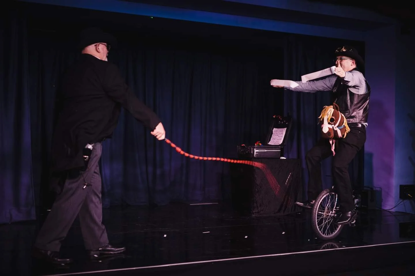 His reassuring voice, quick wit and great presence, allied to his whip skills and sense of fun has driven the proceedings, eased the way and provided direction for an endless number number of circus themed events, weddings, banquets and Dining Ins across the country.